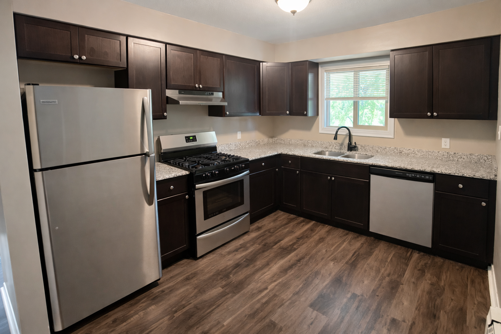 All new upgrades including huge kitchens, featuring mocha cabinets, granite counter tops, stainless steel appliances, gas cooking ranges (for all you gourmet chefs out there), new hardwood style flooring, paint, lighting, blinds and carpeting, updated bathrooms, updated closets, new windows, etc... Basically you can get the luxury finishes that you see in the brand new buildings for hundreds less in rent. Property features secured entrances, video surveillance, laundry center, awesome dog park on site with city park 1 block away, plenty of off street parking.